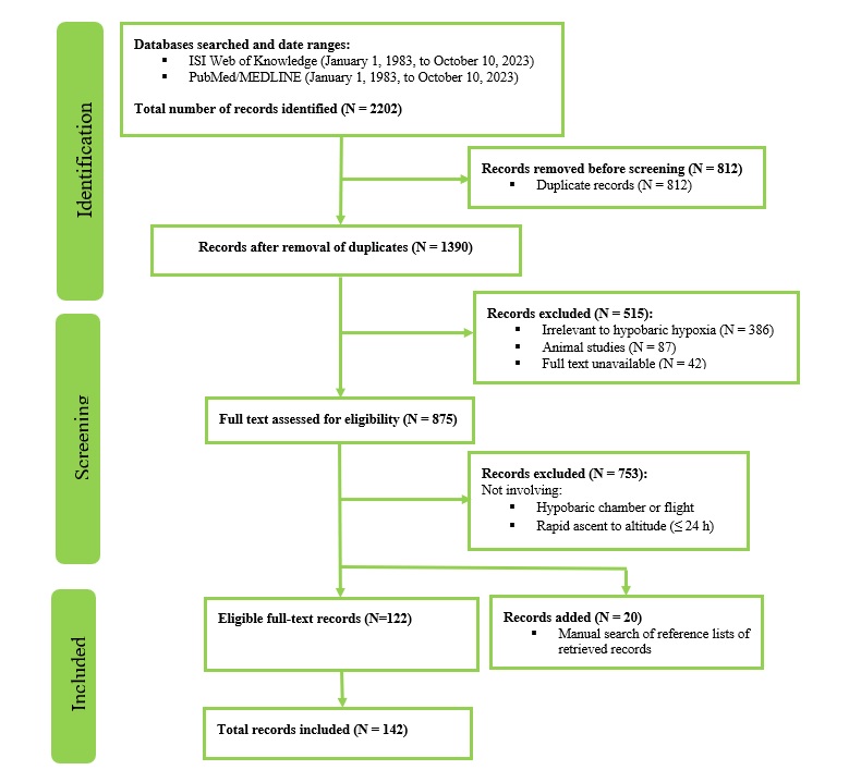 Background: Exposure to high-altitude conditions during flight or similar activities affects many aspects of visual function, which is critical not only for flight safety but for any altitude-related activity. We aimed to summarize the available literature pertaining to ocular changes during flight or equivalent short-term high-altitude exposure (e.g., hypobaric chamber, effortless ascent lasting less than or equal to 24 h) and to highlight future research priorities.Methods: Using the PubMed/MEDLINE and Web of Science/ISI Web of Knowledge databases with structured search syntax, we conducted a systematic review of the literature spanning a 40-year period (January 1, 1983, to October 10, 2023). Articles pertaining to ocular changes during flight or flight-equivalent exposure to altitude were retrieved. The reference lists of retrieved studies were also searched, and citations of these references were included in the results.