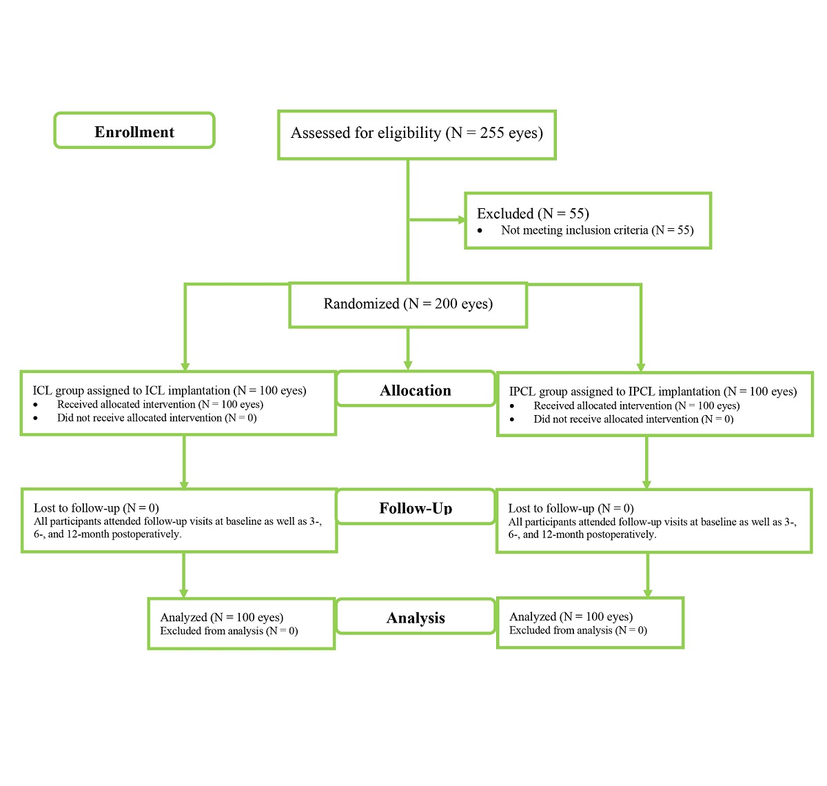 Results: The groups had comparable demographic characteristics and baseline visual and anatomical values (all P > 0.05). The UCDVA, BCDVA, and SE of the two groups were comparable at baseline and at all postoperative follow-up examinations (all P > 0.05). Both groups experienced significant improvements in UCDVA, BCDVA, and SE at three months postoperatively (all P = 0.001), and measurements remained stable for up to 12 months. Keratometry readings were comparable between the groups over the follow-up period and remained unchanged at all visits (all P > 0.05). The ACA in the ICL group was significantly decreased at three months postoperatively (P = 0.001) and then widened significantly at 6 and 12 months (both P = 0.001). In the IPCL group, the postoperative ACA was significantly decreased at three months (P = 0.001) and was comparable to that in the ICL group (P > 0.01). However, at the 6- and 12-month postoperative visits, the ACA was significantly narrower in the IPCL group than in the ICL group (both P = 0.001). The ACD in both groups was decreased at three months postoperatively (both P = 0.001) and remained stable until the end of the study. The ECD remained comparable between the groups at all postoperative visits (all P > 0.05). We did not observe a significant ECD reduction in either group at any postoperative follow-up visit (all P > 0.05). We encountered no serious complications in either group.