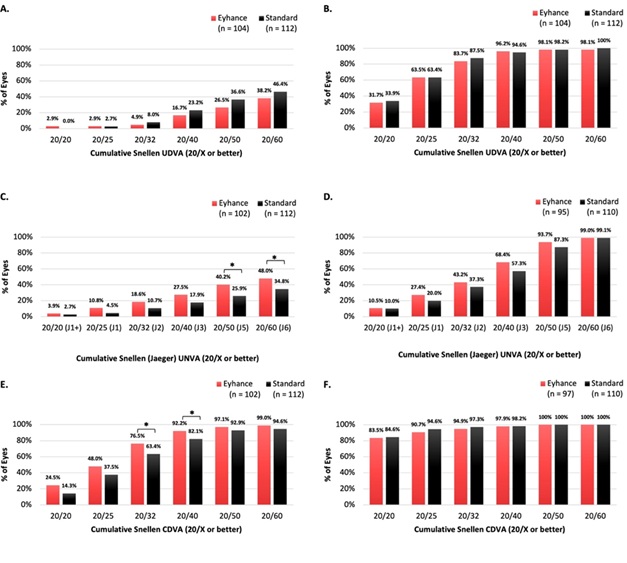 Results: In total 108 patients (216 eyes) underwent bilateral implantation with either TECNIS Eyhance (104 eyes) or TECNIS Monofocal 1-Piece (112 eyes) IOLs. The mean (standard deviation [SD]) binocular UNVA was better in the Eyhance group at 1 month (0.18 [0.13] logMAR) compared to the standard monofocal group (0.24 [0.14] logMAR; P < 0.05). A greater proportion of Eyhance patients achieved binocular UNVA of 20/25 or better (46.9% vs 21.8%; P < 0.01), and 20/32 or better (65.3% vs 45.5%; P < 0.05). However, there was no significant difference for 20/20 visual acuity (20.4% vs 18.2%; P > 0.05). No significant differences were observed in postoperative UDVA or CDVA between groups (both P > 0.05). The mean (SD) monocular UNVA showed a slight, but non-significant, advantage in the Eyhance group (0.26 [0.15] logMAR vs 0.29 [0.15] logMAR; P > 0.05). Eyhance eyes demonstrated less residual refractive cylinder at 1 month (P < 0.01), which may be attributed to a higher rate of toric IOL use (P < 0.01). Patient-reported visual symptoms did not differ between groups. Thirteen studies were identified that compared the Eyhance and standard monofocal IOLs. Across the studies analyzed, the Eyhance group showed better monocular and binocular UNVA with mean (SD) differences of - 0.10 (0.20) logMAR and - 0.10 (0.21) logMAR, respectively (both P < 0.01), as well as improved binocular uncorrected intermediate visual acuity (UIVA) (mean difference [SD]: -0.10 [0.18] logMAR; P < 0.01). These studies also showed low rates of glare and halos for both IOLs.