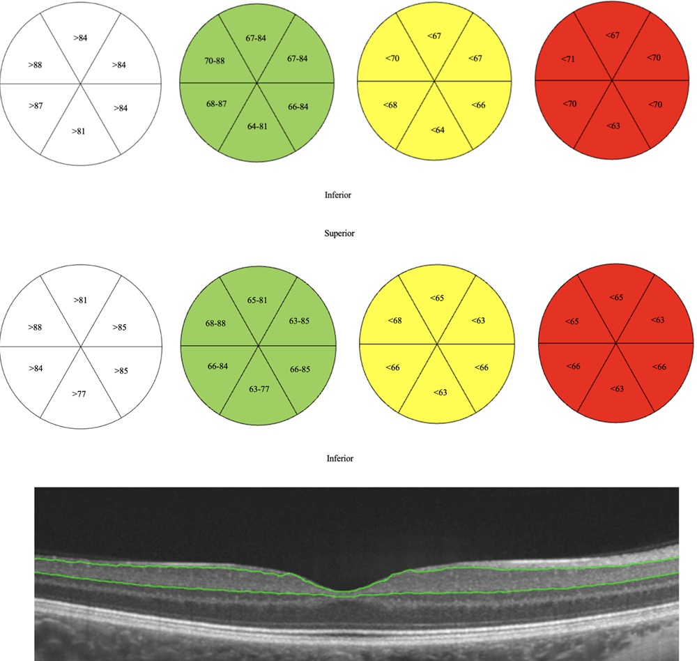Results: Sixty-nine children (n = 33, 48% girls), with a median age of 7 years (5–7-year age group) and 13 years (8–17-year age group), were included. The total macular thickness was 287.5 µm (11.1) and 290.5 µm (13.8), GCL+ thickness was 75.7 µm (4.2) and 74.9 µm (5.2), and cpRNFL thickness was 111.5 µm (10.2) and 108.3 µm (7.9) for the 5–7-year and 8–17-year age groups, respectively (mean [standard deviation]). Mean retinal thickness measures did not differ significantly by age or sex (all P > 0.05). Correlation between repeated measurements showed excellent repeatability: 0.991 for both total macular and GCL+ thickness, and 0.954 for cpRNFL (all P < 0.001). Spherical equivalent did not correlate significantly with retinal thickness measures (all P > 0.05).
