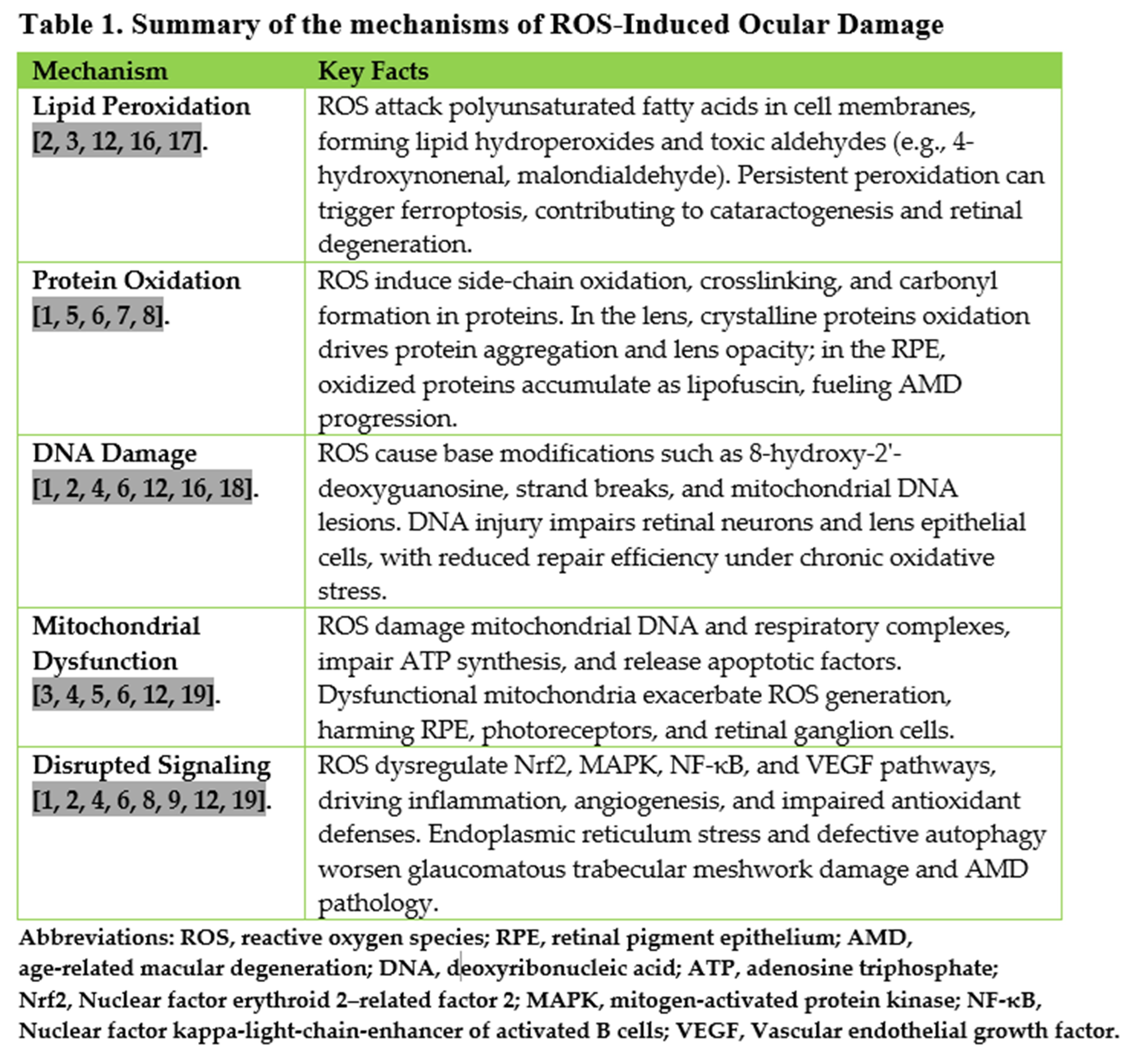 Results: Evidence consistently demonstrates that ROS induce lipid peroxidation, protein oxidation, DNA damage, mitochondrial dysfunction, and disruption of redox-sensitive cellular signaling pathways across ocular tissues. In cataracts, oxidation of crystalline proteins and glutathione depletion are primary drivers of lens opacification. In age-related macular degeneration, mitochondrial dysfunction and lipofuscin accumulation promote retinal pigment epithelium degeneration and neovascularization. Glaucoma involves both trabecular meshwork oxidative injury, contributing to elevated intraocular pressure, and mitochondrial-driven retinal ganglion cell apoptosis. In diabetic retinopathy, hyperglycemia-induced ROS overload activates pathogenic pathways, leading to microvascular damage and neuronal dysfunction. Clinical and experimental studies support antioxidant therapies as adjunctive strategies, with the strongest evidence for Age-Related Eye Disease Study-based formulations in age-related macular degeneration and promising results for agents such as Coenzyme Q10 in glaucoma and sulforaphane in diabetic retinopathy. For cataracts, supplementation trials have yielded mixed outcomes and surgery remains the definitive treatment.