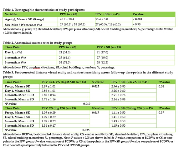 Results: Ninety eyes of 90 patients with primary RRD were included (PPV: n = 45 eyes; PPV+SB: n = 45 eyes). The PPV group was approximately a decade younger (45.2 vs. 55.4 years, P < 0.05), while sex distribution was similar in both groups (P > 0.05). Anatomical success rates improved over 3 months, reaching 74.0% (n = 33) for PPV versus 62.2% (n = 28) for PPV+SB. PPV achieved significantly better final BCDVA (2.71 vs. 2.84 logMAR, P < 0.05). CS increased significantly over time in the PPV group (P < 0.05) but remained stable in the PPV+SB group (P > 0.05). Although the final CS was significantly higher in the PPV+SB group compared to the PPV group (P < 0.05), this difference reflected the higher baseline values in the former group. Overall, PPV alone provided greater anatomical and functional improvement over 3 months than did the combined surgery.