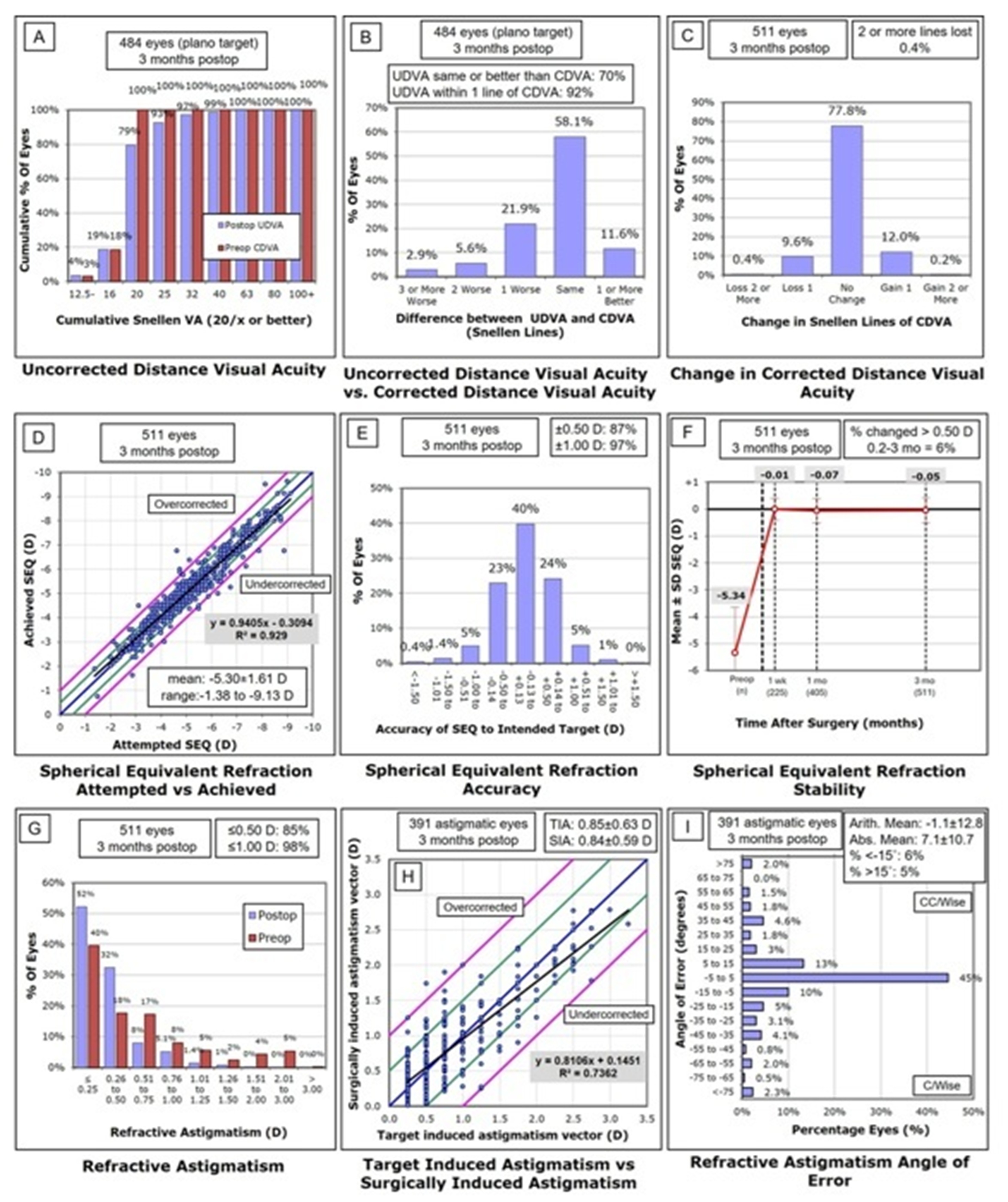 Results: Of 577 treated eyes, data were available at 3 months for 511 eyes (88.6% follow-up) and 12 months for 440 eyes (76.3% follow-up). Mean spherical equivalent (SEQ) improved from -5.35 ± 1.62 D (-9.63 to -1.38 D) to -0.04 ± 0.44 D (-1.88 to 1.88 D) (P < 0.001). Mean cylinder improved from -0.66 ± 0.66 D (-3.00 to 0.00 D) at baseline to -0.40 ± 0.32 D (-1.75 to 0.00 D) at 12 months (P < 0.001). Additionally, postoperative UDVA was 20/20 or better in 81% of eyes and 20/25 or better in 94% of eyes. Postoperative SEQ was within ±0.50 D in 85% of eyes and within ±1.00 D in 97% of eyes at 12 months. The SEQ remained stable across all postoperative visits, with a mean change of -0.03 ± 0.38 D from 3 to 12 months. There was a gain of one line of CDVA in 16% of eyes at 12 months, with no eyes losing two or more CDVA lines. Target-induced and surgically induced astigmatism were strongly correlated at both 3 and 12 months, with a mean undercorrection of 20% by one year (R² = 0.69).