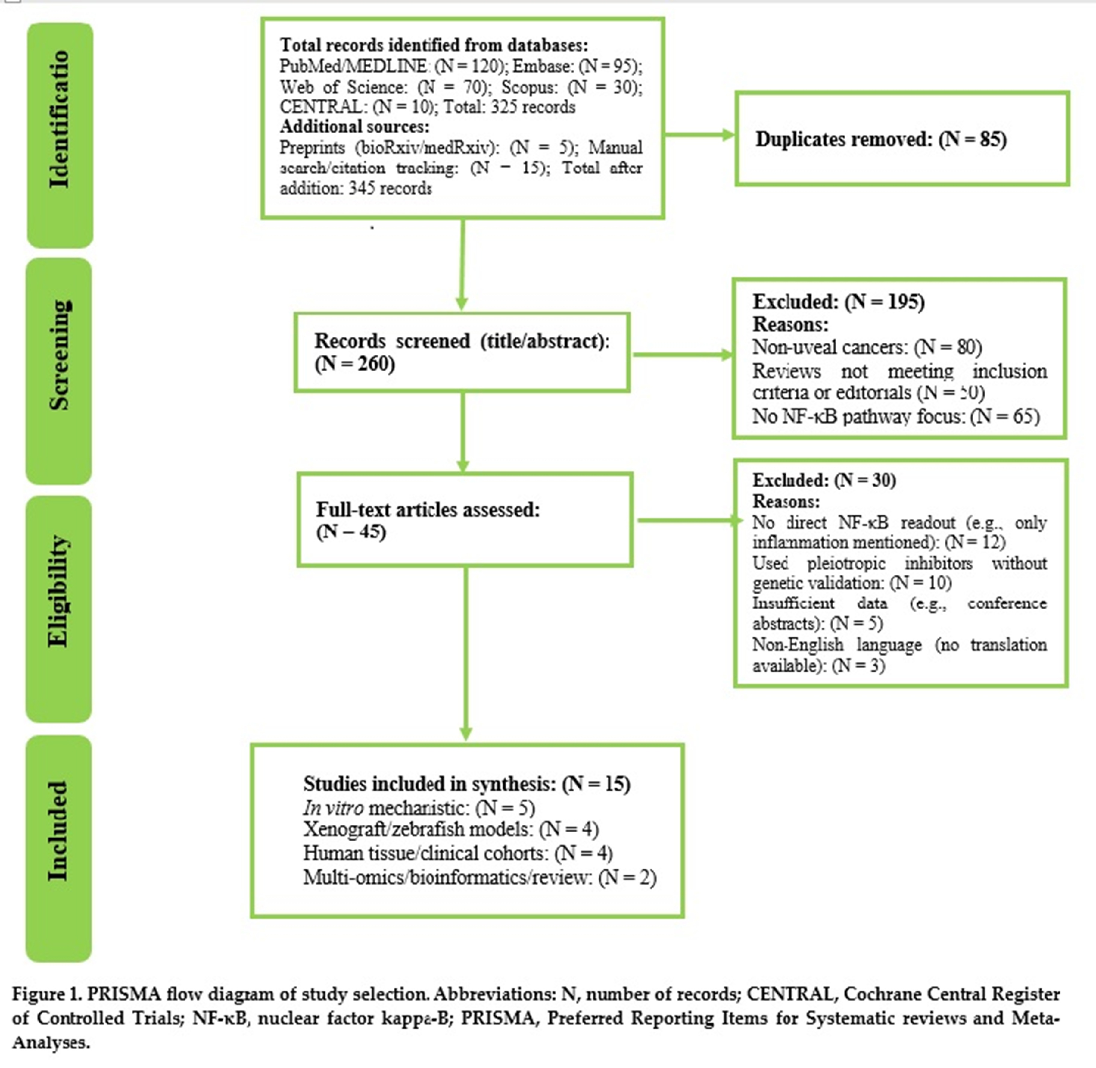 Background: Uveal melanoma (UM) is an aggressive intraocular malignancy with high metastatic potential to the liver and poor prognosis. The nuclear factor kappa B (NF-kB) pathway, comprising the canonical and noncanonical branches, has been involved in UM development, tumor-microenvironment communication, and drug resistance. This review consolidates the evidence for NF-kB involvement in UM pathogenesis and therapeutic target value.Methods: A comprehensive search of PubMed/MEDLINE, Embase, Web of Science, Scopus, and the Cochrane CENTRAL database was performed from inception to June 2025. Studies investigating NF-kB activation, functional dependencies, genetic or microenvironmental modulators, or therapeutic interventions in UM were eligible. Included designs comprised original observational or experimental research, including mechanistic in vitro studies, animal models, and human tissue–based prognostic or correlative studies. English-language articles and relevant review studies addressing the research question were considered. Exclusion criteria included editorials, commentaries, conference abstracts with insufficient data, case reports lacking mechanistic insights, non-UM cancers without validated UM models, studies mentioning inflammation or NF-kB targets without direct NF-kB readouts, and those using pleiotropic inhibitors without genetic validation or pathway-specific evidence. Appropriate design-specific tools were applied to assess risk of bias.