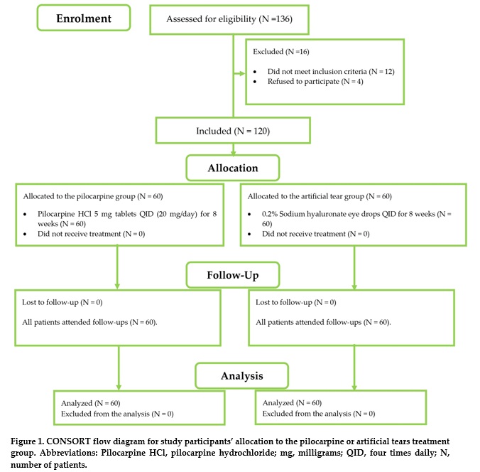 Background: Dry eye disease (DED) is a common multifactorial ocular surface disorder that substantially impairs quality of life and remains among the leading reasons for ophthalmic consultations worldwide. We aimed to compare the efficacy and safety of oral pilocarpine versus artificial tears (AT) in the treatment of DED.Methods: This randomized clinical trial study enrolled patients with DED, randomly allocated to a pilocarpine group receiving 5 mg pilocarpine hydrochloride tablets four times daily (20 mg/day) or an AT group receiving 0.2% sodium hyaluronate eye drops four times daily, for eight weeks. Primary outcomes were changes in Dry Eye Quality of Life Score (DEQS), tear film breakup time (TBUT), and Schirmer’s test after treatment. Secondary outcomes were incidence of adverse events like brow ache, sweating, nausea, headache, diarrhea, and allergic conjunctivitis (AC).