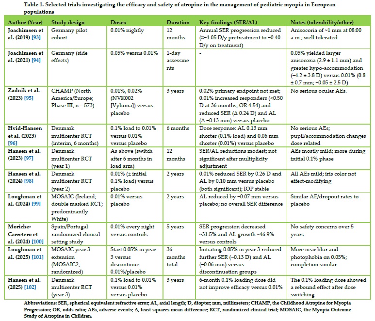 Results: The evidence reviewed indicated that increased outdoor time consistently reduced incident myopia and modestly slowed progression, supporting the adoption of low-cost prevention strategies. Associations between near work and digital exposure and myopia were less consistent, though moderation in these activities remains advisable. Optical interventions showed consistent efficacy compared to single-vision correction, with strong evidence for defocus incorporated multiple segments (DIMS) lens with highly aspherical lenslet technology spectacles, and dual-focus/high-add soft contact lenses. Safety was generally favorable, although contact lens wear requires infection-risk mitigation. Orthokeratology was effective in slowing AL but requires specialist fitting and structured follow-up, and may be followed by rebound after cessation. Atropine showed a concentration-dependent effect; 0.01% atropine produced inconsistent AL benefit in several non-Asian trials, but longer-term European data suggest a cumulative advantage with continued 0.01% treatment versus placebo. Repeated low-level red-light therapy reduced axial elongation in early trials but was limited by protocol heterogeneity, rebound, and uncertainty regarding long-term safety. Combination regimens (notably orthokeratology plus low-dose atropine and DIMS plus atropine) may provide additional slowing of AL, particularly in children with faster progression.