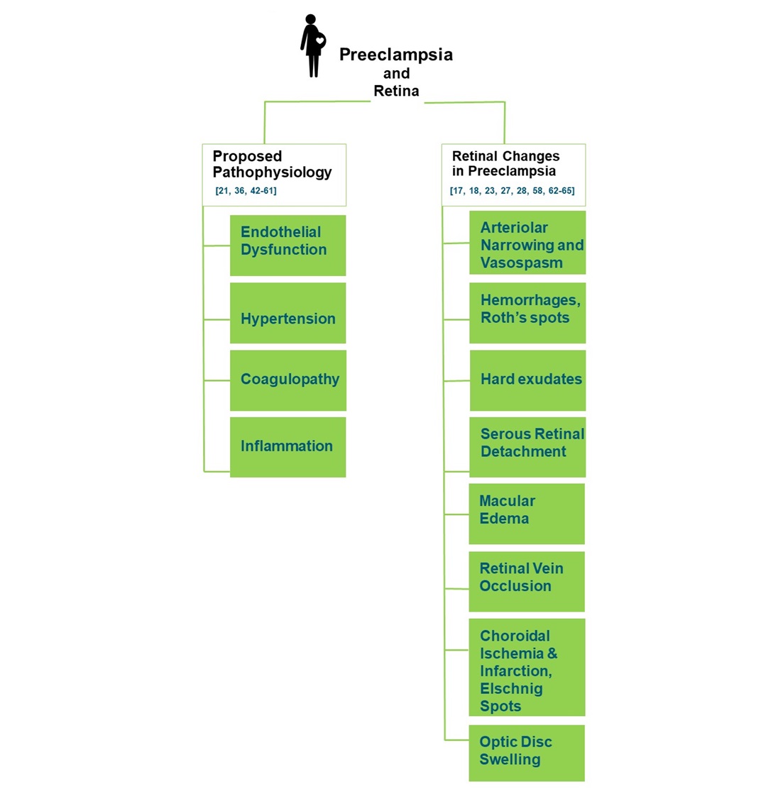 Conclusions: Visual disturbances may precede and portend the onset of PE. Early detection and prompt management will mitigate fetal and maternal morbidity and mortality. Understanding the underlying pathophysiology of PE-related retinal manifestations is crucial for optimal management, because the majority of manifestations are reversible. Although retinal changes secondary to PE typically resolves postpartum, some studies demonstrated that women with PE may have a higher long-standing risk of ocular disorders. A multidisciplinary team approach involving obstetricians, ophthalmologists, and healthcare providers is essential for the immediate and long-term management of ocular consequences in pregnancy. Consequently, additional studies associated with robust methodologies are required to develop clinical guidelines.